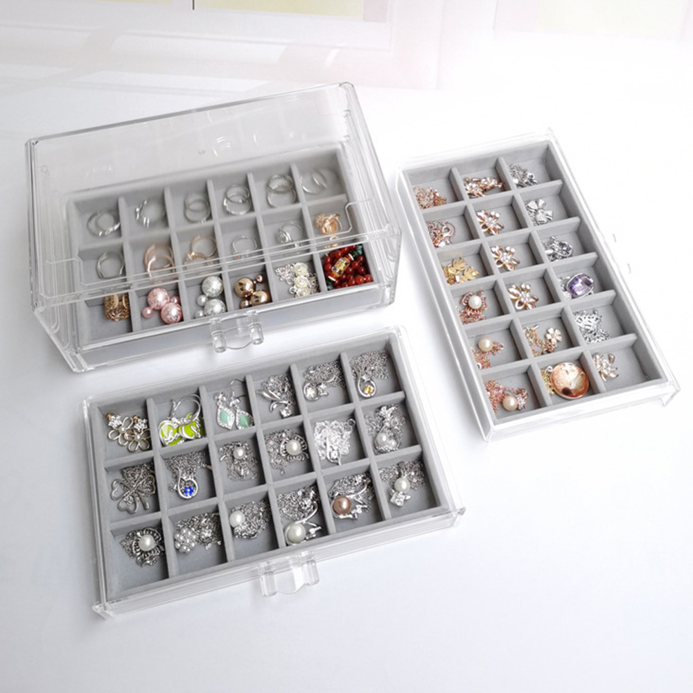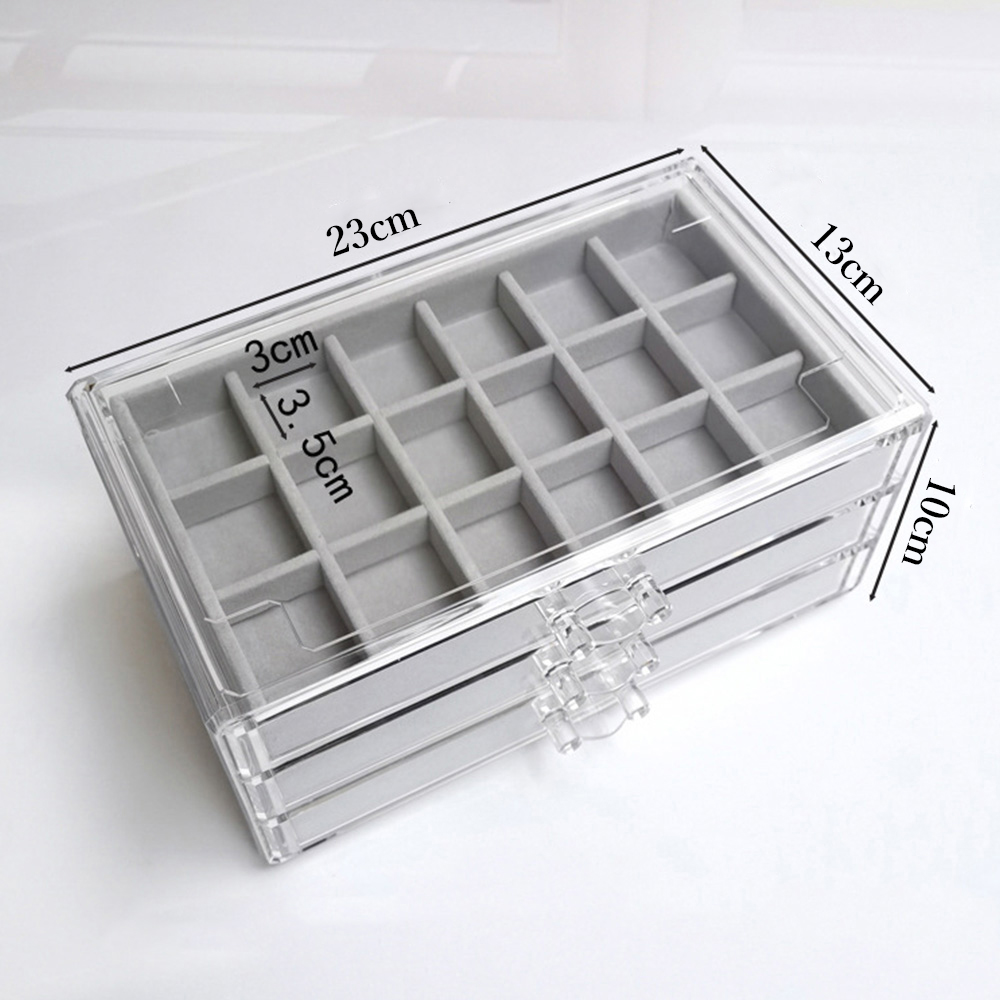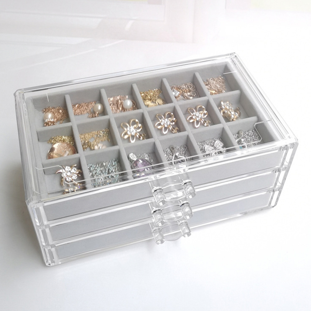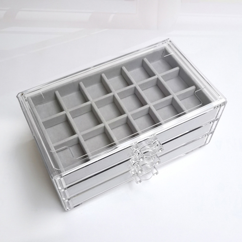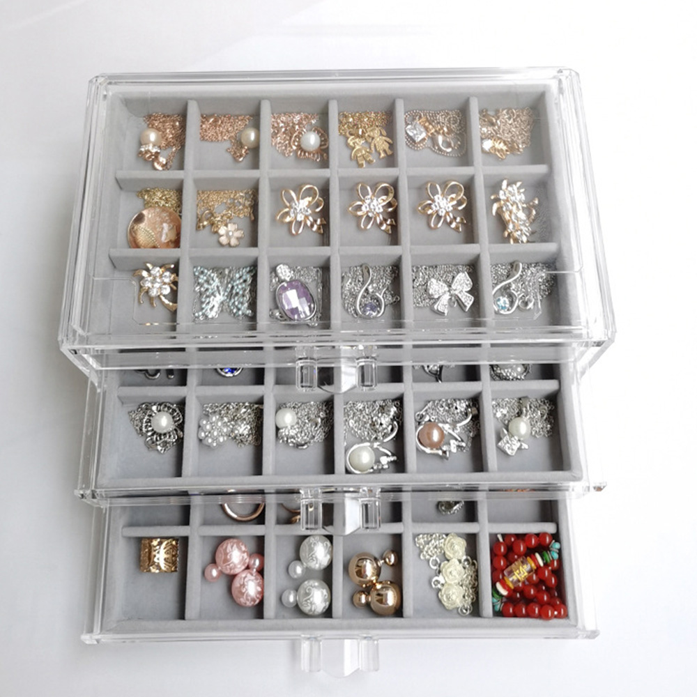 透明な三段引き出し式の収納ボックスで、指輪やピアスなどの小物を美しく整理できます。