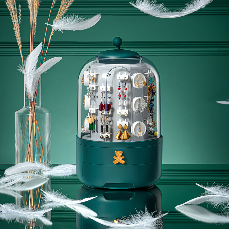 大切なアクセサリーを美しく飾りながら整理できるグッズ収納に最適なディスプレイケースです。 透明なドーム型デザインで中身が一目で確認でき、回転式の台座により取り出しも簡単です。 ピアスやイヤリング、ネックレスなどを種類別に掛けられるフック付きで、絡まりを防ぎながらすっきり収納できます。 蓋付きで埃からしっかり守り、インテリアとしてもおしゃれな存在感を放ちます。