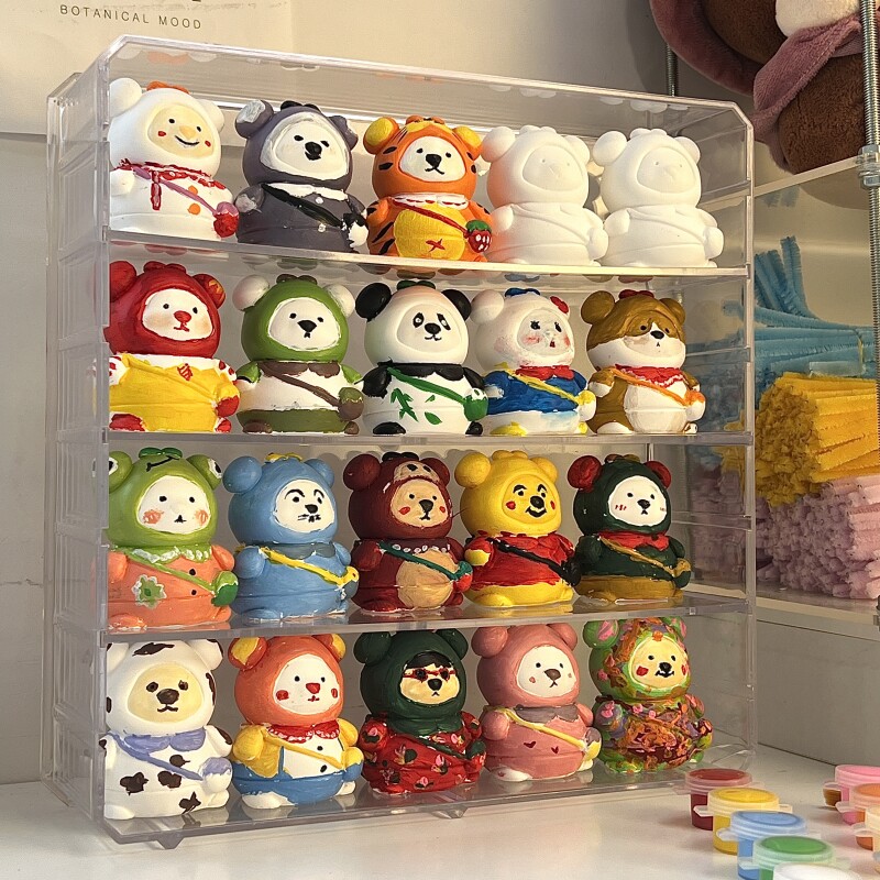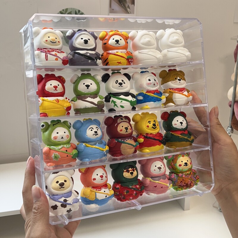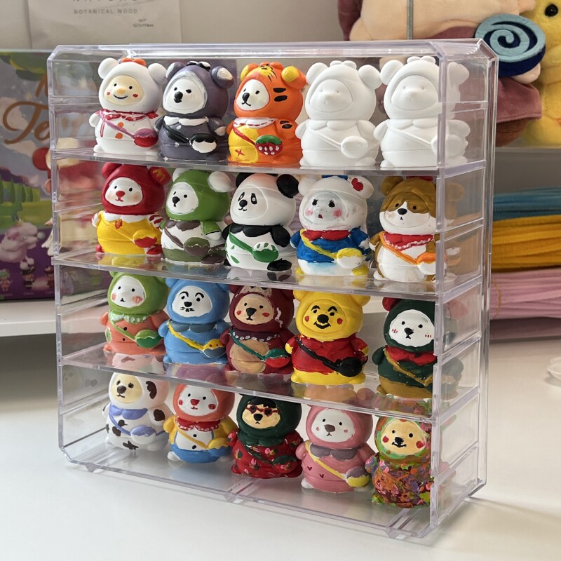 可愛らしいミニチュアやキャラクター小物をきれいに並べて飾れるディスプレイケースです。 四段構成で20個程度のコレクションアイテムを整理整頓しながら美しく展示できます。 透明な素材により全方向から中身を鑑賞でき、埃や汚れからも大切なグッズ収納を守ります。 引き出し式の各段で出し入れも簡単、デスクや棚上で場所を取らずにコンパクトに設置可能です。